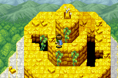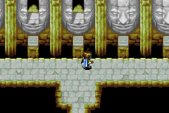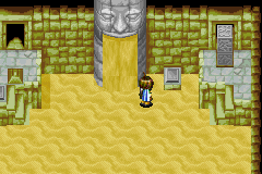 The horizontal hallway-like room here, lined with seven stone heads (with the center one having an open entrance immediately visible and reachable by hopping) is the closest thing this dungeon has to a "hub". There are also exits at the hall's two far ends. What many players never realize, however, is that each of the other six stone heads in the room actually has a hidden entrance behind it just like the visible entrance behind the center head, and that each head's entrance can be opened by hopping onto the platform in front of that head and casting Move to pull out the portion of the head obscuring the entrance and drop it into the abyss. Using this method, enter and explore each of the closed six heads, preferably from right-to-left; the first head from the right end of the hall hides a small room with a chest containing a Crystal Powder. The second from the right end, with a small room with a Whirlwind-able bush behind it concealing another entrance, leads to an area with an earth pillar near a chest; stand north of the earth pillar and Move it one space to the right. The third head from the right only hides a dead-end room. Now, go to the leftmost head in the hall, and you'll get to the area with the earth pillar you just moved; cast Sand while standing on the yellow sand stream on the ground, and move upwards under the blocks, surfacing right next to the earth pillar. This demonstrates how the Sand Psynergy will be used throughout the dungeon. Collect the Nut from the chest, then exit, and explore the entrance in the head to the right of the leftmost one. The chest here contains 210 coins. The last stone head's entrance contains a dead-end room with a Whirlwind-able bush that is not hiding anything.