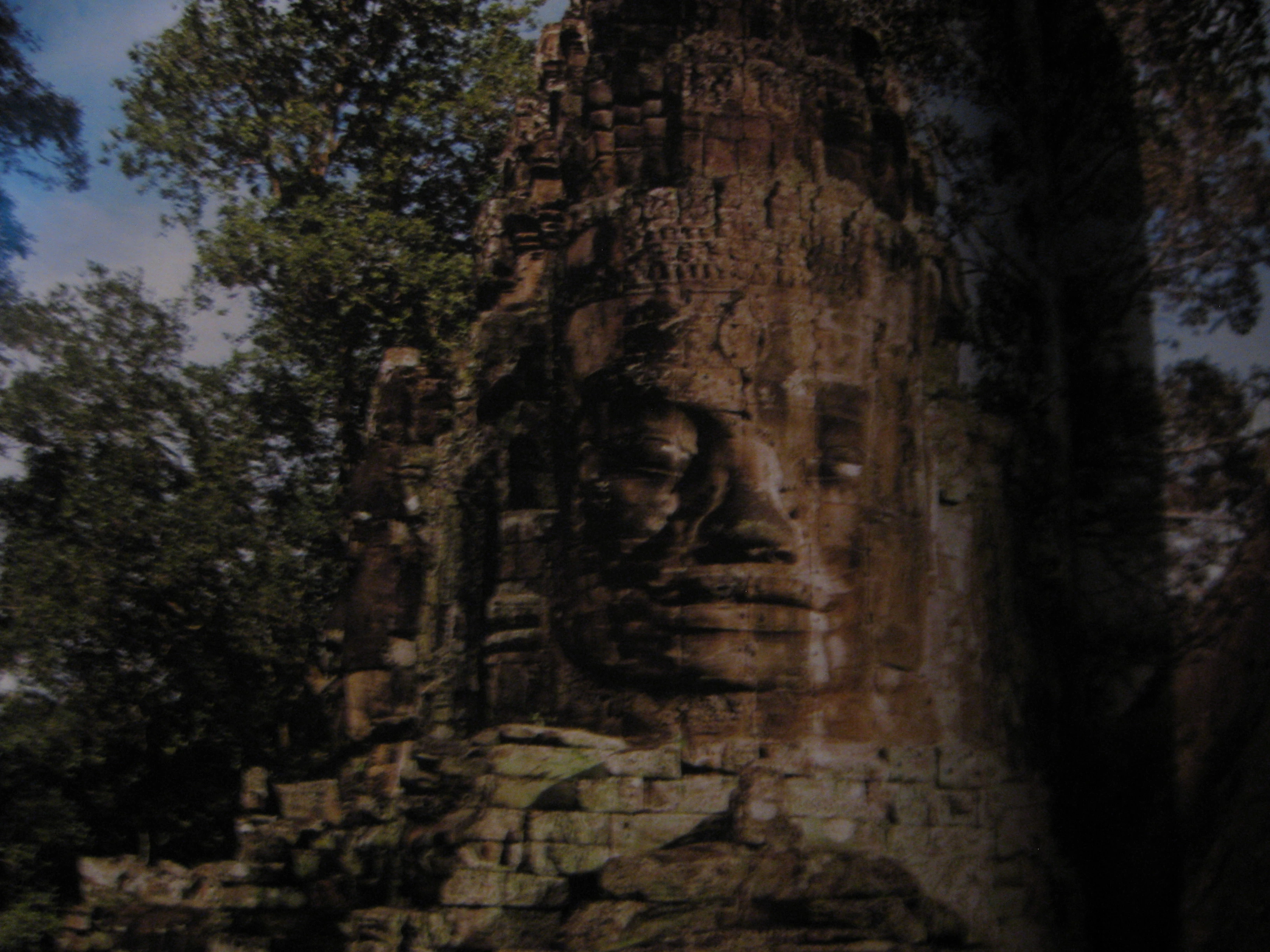 A stone head carving found in the Angkor ruins of Cambodia