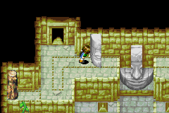 A long, winding, occasionally hopping path will eventually lead you to sliding off into a big hole in the ground, dropping you into a large area with many different aspects to it, such as both a nearby earth pillar and a nearby piece of stone head that can and should be put in their respective proper places right away. Then leave the room out of the door to the top. When you enter the room above (ignore a strange visual glitch that often occurs here where Felix appears to enter the room by falling from the ceiling), you'll see a nearby upstairs which for now leads to a dead-end, and two Whirlwind-able bushes next to it, with the right one obscuring an entrance which leads to what is pretty much always a dead end; check both of these if you want, but then go right to where an earth pillar can be moved once space to the right, and use Move to push it one space to the right, opening up an exit to a sand trail (doing this is basically the whole objective of the left wing of the dungeon). Go back to the previous room, climb down the vines to the left, and go into the door below the earth pillar you moved. The path you will traverse, with a Sand-based obstacle near the end, will lead you back into the main "hub" hall with the seven stone heads, with you exiting the door in the center head.