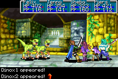 - At a certain point in the dungeon, you will slide down a black hole and abyss in the ground into the larger room below, where there is both an earth pillar to the left and a piece of stone head to the right that can be pushed. There is a slight visual glitch that occurs the first time you exit this room via either the nearby door above or the door below that you climb the ivy down to; when the next room is brought up on screen, Felix will appear to "drop down" into the room from the ceiling in front of the doorway he would normally have walked through. This is practically guaranteed to happen in one's game, and it happens only once, since afterward when you exit and reenter these rooms you do so normally. The believed reason this glitch exists is that when you slide from the room above into the room below, a value is turned on that dictates Felix will appear in the new room with a visual "fall from the sky", but this value is mistakenly not "turned off" as soon as Felix falls into this room, unlike how it would happen with other slides leading to other rooms in other dungeons. Instead, the "fall from the sky" instruction only turns off the next time you enter a room and you appear to "fall from the sky" a second time in a row, which is how the glitch manifests. This glitch also can appear if you are attacked prior to leaving the room; once the battle is over Felix appears to fall again.