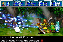 In Golden Sun, the Arctic Blade is the strongest weapon for when it can be first found. However, its Unleash effect being Mercury means that it will not be as damaging as it can potentially be in the hands of the only two warrior-style Adepts that can wield it at that point in the series, the Venus Adept Isaac and the Mars Adept Garet. The Unleash's damage can be increased somewhat if a warrior Adept has Mercury Djinn set onto him to increase his Mercury levels, but then an interesting scenario occurs; the Swordsman/Defender class that results on that Adept has the Cutting Edge Psynergy which is an elemental physical attack just like Blizzard. The two effects differ in that Cutting Edge is more powerful and can occur for you whenever you want it, but it casts 5 PP each time, while the weaker Blizzard that only occurs by chance does not consume PP and may lower the target's Attack rating as a beneficial side effect. Whether the straightforward and strong Cutting Edge or the Blizzard is tried as an attack for a given turn is a matter of strategy.