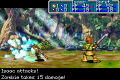 Obviously this is a ubiquitous staple and convention of almost every fantasy Role-Playing game ever made. In the Golden Sun games, however, the Attack command has a particularly unique significance in the overall scheme of battling methodology, compared to other RPGs' battle systems. A large percentage of the game's equippable weapons (the primary pieces of equipment that increase Attack Rating) have what are called Unleash effects, which are bolstered attack-based magic effects that have a chance to automatically commence in place of a normal attack whenever the equipped Adept uses the Attack Command. Unleashes almost always takes the equipped Adept's attack rating and damage the target with an effect that is a dramatic enhancement of what would otherwise have been a banal physical attack. Because of the nature of Unleash effects hidden within each weapon, this makes physical attacks often the most powerful method of dealing sharp amounts of damage to individual targets on the battlefield; to compare, Psynergy spells and Djinn effects are a variety of effects that do less powerful elemental damage to multiple opponents at a time or to provide support to your own party, and Summon sequences are colossal maneuvers that do heavy elemental damage to all opponents at once but leave the summoning Adept weaker as a result.
