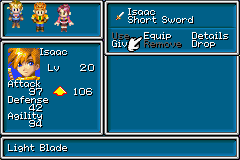 An Adept's Attack is determined by their level, class, and by which weapons and various other items such as certain armor, crowns, and rings, you currently have equipped. In battle you can temporarily increase your Attack by using Psynergy, but at the same time your Attack can be temporarily dropped by an enemy's Psynergy or Monster skill.