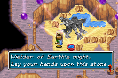 To get to the initial hallway in the interior of Gaia Rock , use retreat, then take the pathway in the front up. When you get to a screen where two small earth objects block your path and need to be moved out of the way, Move the lower object two spaces up and one space right, and Move the upper object two spaces right, two spaces down, and one space left. Proceed out of this room's exit.