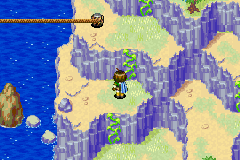 From the end of the hopping puzzle, follow the path up, climb up the ivy, go down the greenish path to the right, then hop left across the gap you just crossed through. Your path branches between the ivy below the pair of trees and the path above them; go up the path above them to be linearly lead to a chest containing a Sleep Bomb, then go back and climb down the ivy. Follow that subsequent path to where there is a rope tied to provide a path west across the continental divide. (Incidentally, if you are exploring Gondowan Cliffs after having received the Scoop Psynergy but did not defeat Briggs yet, there will not be a rope here, but instead a pair of rarely-encountered Kibombo tribesman NPCs, preventing your passage into lower Gondowan).