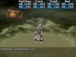 In a boss fight, using Ivy can potentially be quite useful from a defensive perspective because one of the boss' multiple actions this turn will be prevented from happening. Negating one of the powerful assaults of the final boss makes that probably the best example of a battle where Ivy can be critically useful. It can be useful against the other, optional bosses as well, especially against the Star Magician - if the unleashing Adept is faster than the Guardian Ball, Ivy can prevent the Guardian Ball from using its own high-priority move Guard Aura to make the boss practically invincible, allowing your other Adepts to safely perform a massive summon rush that will deal appropriate damage.