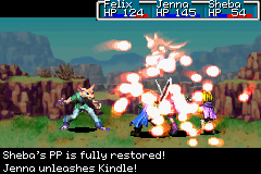 Golden Sun: The Lost Age: Up until Isaac's party joins Felix's party along with their returning Djinn, Kindle is the one Djinni that is High Impact doubled in effectiveness, and since High Impact is a Psynergy that is not available to any Adept until level 21 while this Djinni is acquired some time before that, this can be a valuable battle effect to players who incorporate buffing all party members' attack ratings in their battling approaches. Technically, this Djinni only gets better as the game progresses and party members' attack ratings increase. Using the mindset of buff-then-battle, this has the capacity to be very useful as an upgraded High Impact substitute on an Adept that does not have the spell (i.e. Jenna when in her mono-elemental Flame User class series), even when another Adept in the same party does have the spell (i.e. Sheba when in her mono-elemental Wind Seer class series). When Isaac's party joins later, they bring with them the identical Mars Djinni Forge, so now you have two Djinn whose effects are two High Impacts worth of attack buffing at once. Whether you find it useful for Adepts, with or without High Impact, to have one or both of these Djinn Set onto them ready for them to use is entirely up to you and whatever battling approach you deem worthy, though.