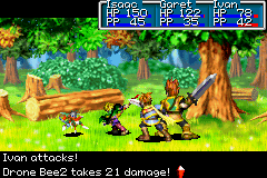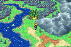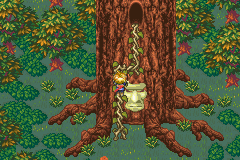 In the final screen of Kolima Forest (which returns to random monster battles), the tree spirits Tret and Laurel may be interacted with. A fairly obviously climbable vine next to Tret's face lets you climb into the entrance above his head, thus starting you off on Tret Tree, a dungeon that is essentially the "second portion" of the Kolima dungeon set. Eventually on your quest, you would want to use the Hermes' Water on Tret's face here, and in a typical game, after playing through Tret Tree and defeating the boss within, one must leave Tret Tree and Kolima Forest (easiest done with the Retreat Psynergy) and proceed on the full Mercury Lighthouse segment of the game, at the end of which you get the Hermes' Water. However, if you played through and completed Mercury Lighthouse before entering Kolima and have the Hermes' Water, you will be prevented by a brief, different cutscene from using it on Tret's face until after the boss inside Tret Tree is defeated.