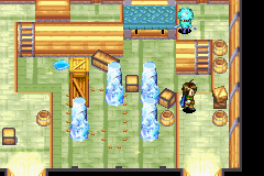All Aqua Jellies turn into puddles which can be turned into ice pillars with the Frost Psynergy, and a second Aqua Jelly below the first demonstrates that this will be used in solving puzzles; defeat it, freeze its puddle into a pillar, and hop left across the pillar to reach a chest containing a Potion. Proceed down the stairwell to the lower right, and enter a doorway in the hallway beyond that (incidentally, hallways like this that are not inhabited by Aqua Jellies are areas with random encounters against Conch Shells, which are only fought in these areas at this point in the game). The subsequent room has many Aqua Jellies visible amongst crates, but you cannot reach them for now, so exit out of the doorway to the lower right, and in the next hallway enter the doorway to the right.