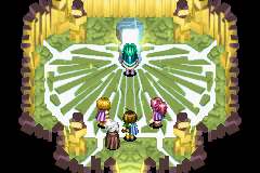 Follow the linear path down to a lower level, where a simple puzzle just like in the previous game's Tunnel Ruins is located: Push the empty pillar at the lower right one space up and once space left onto the water-drop tile, and cast the Douse Psynergy on the pillar to make it sink into the tile and open the door above. The linear path that follows leads to the last room, where a cutscene automatically triggers to make the Lemurian Ship sail into the ocean under your control, thus rendering the dungeon complete and East Indra Shore no longer visitable.
