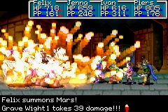 Mars is the first Mars-based Summon sequence in both Golden Sun and Golden Sun: The Lost Age. When one Djinni of the Mars Element is on standby, the Mars Summon sequence can be activated. It resembles an image of a Mars Djinni diving into the enemy party and setting off a fiery bomb. It has a base Mars power of 30 and also does additional damage equivalent to 3% of the enemy’s maximum HP.