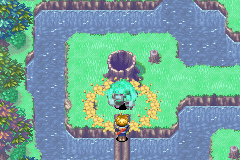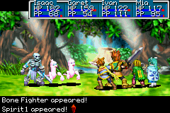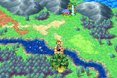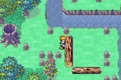 At a room with another river, stand up above the horizontal log held in place by a rock on the ground, and cast Move to remotely shift the rock one space down so that you can now roll the log down. Roll down the next horizontal log you find, and roll left the next vertical log you find to clear a path to a Venus Djinni, which you must battle to earn, so save beforehand. After earning the Venus Djinni Quartz, you may roll the horizontal log up and the vertical log further left so that it falls into the river, letting you hop to a stump on an island whose green Ape jumps into the stump to the left of that. Regardless of whether you do so, return to the top part of the screen, cross the river via the wooden plank and go south along the left path to get to an area where there is a west exit and a south exit and the second stump; if the green Ape resides here now, using force on the stump shows you are to go out the left exit. Pass west through another linear screen.