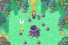 As soon as you enter, you'll see a green-furred Ape monster jump into a hollow stump. If you've completed Fuchin Temple and the Fuchin Falls Cave it connects to, you would have the Orb of Force that grants the equipped Adept the Force Psynergy, and would have also received instruction from Master Nyunpa that you are to use Force on empty tree stumps to cause monsters to flee from you and inadvertently lead you deeper through the forest. For after all, this location has several screens that loop back onto themselves when you try to reach their ends, making this somewhat of a classic "Lost Woods"-style RPG dungeon. Uniquely, using Force on all tree stumps to have the green Apes lead you through the forest is not at all necessary; you can both find your way through the forest and find side-rooms containing treasures without the directional help of green Apes, and therefore the whole area can be completed without having the Force Psynergy.