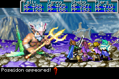 It would eventually come to Piers and Felix's attention that though it is technically possible for them to navigate their ship into the Sea of Time, any effort for them to make it to Lemuria would be doomed by an encounter with Poseidon, who is completely invulnerable to any conventional offenses the Adepts could possibly mount. They learn of Poseidon and learn that he has one weakness only: A legendary weapon named the Trident of Ankohl, rumored to allow its wielder to no longer fear anything of the sea. The three prongs of the armament have long since been split up and enshrined within separate, ancient, towering dungeons located across the Great Eastern Sea, though, but this becomes what motivates Felix's party of Adepts to thoroughly explore the lands of the Eastern Sea, develop their abilities as warriors and Adepts, and explore and loot dungeons and locations of their treasures, including the aforementioned Trident prongs.