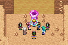 At Trial Road, there lies a wall of sand with a large, peculiar formation in front of it and the Shamans believe that anyone who possesses the power to make the sand disappear is a proven descendant of Contigo. Sheba, with a little bit of wind-based Jupiter Psynergy, passes this test with ease and makes the sand disappear, and Moapa and his subordinates are astounded. Despite Sheba's victory, Moapa objects to the one apparent Adept of Contigo heritage among Felix's party being a girl, since heroes who have tested Trial Road in the past have always been men. Sheba pipes up again, claiming it shouldn't matter what gender Shaman Village's new hero happens to be, and she persuades Moapa to allow them to challenge him and his two Knights in a match of Trial Road. Moapa allows the contest to take place, and at the end of the arduous contest the Adepts manage to achieve victory. Thus do Moapa and Shaman Village deem Felix and Sheba's group valid recipients of the Hover Jade.