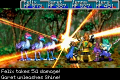 Golden Sun: Dark Dawn: In the short period of time Shine is available to Matthew and Karis in Tanglewood and the Abandoned Mine at the beginning of the game, Shine's damage bonus is astonishingly powerful, dealing around 90 damage when Matthew would be doing a "strong" 30 damage with each of his physical attacks otherwise. Shine, like Sap, scores a one-hit KO on any enemy and makes the Tangle Bloom encounter at the end go by much faster, but unfortunately it is taken away from your possession immediately after this. In the main game, there are more and stronger Mars Djinn that can be collected, especially when Eoleo joins, so Shine won't necessarily be missed.