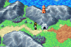 The first new room you reach is an external area bordering the ocean, with many stone pillars to hop across. Hop across the several pillars comprising the leftmost "path" to get to a small elevated island, and hop up and right to the island with a brown earth pillar, and push it down into the gap below. Step onto the earth pillar, hop right, and go down the stairwell to the right of the screen.