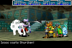 Therefore, a Shuriken cast under these circumstances would deal approximately 200 points of damage. In the GBA games, unlike most ranged Psynergies, Shuriken does not decrease in power as the distance from the targeted enemy increases. Instead, all targeted enemies are dealt the same damage, barring differences in elemental resistance between enemies. As of Dark Dawn, though, damage diminishes at the standard rate.