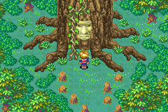 The entire forest seemingly lights up with green as Tret recovers. In thanks, Tret undoes the curse with one decisive maneuver. Tret confesses that he did not always have this horrible power to curse, and that the Psynergy Stones that fell from the sky twisted his anger over people laying waste to his forest into a force beyond his control. Tret and Laurel also shed light on how it was the Psynergy Stones raining everywhere that turned formerly pure-of-heart wild animals across the lands into vicious monsters. When they detect that the stones have caused an evil forest to spring up across the prairie to the southeast that Isaac's group will be going through, Tret warns them to be careful, but assures them that he now at least has the powers to prevent any axe from being taken to him again.
